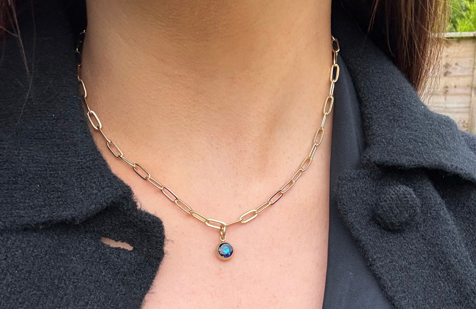 ‘Darcy’ stone charm paperclip necklace in gold or silver with lobster clasp close.